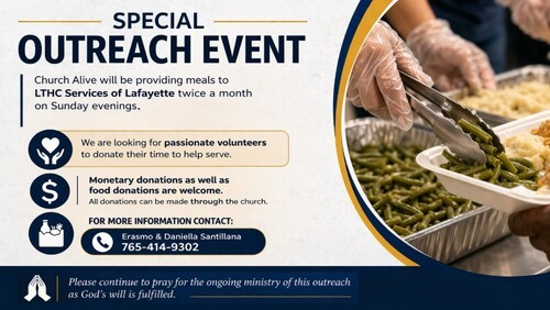 Church Alive will be providing meals to LTHC Services of Lafayette twice a month on Sunday evenings. We are looking for passionate volunteers to donate their time to help serve. Monetary donations as well as food donations are welcome. All donations can be made through the church. Please continue to pray for the ongoing ministry of this outreach as God's will is fulfilled. For more information, please contact Erasmo & Daniella Santillana at 765-414-6302.