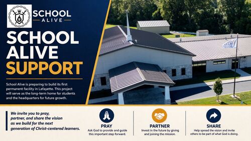 School Alive is preparing to build its first permanent facility in Lafayette. This project will serve as the long-term home for students and the headquarters for future growth. We invite you to pray, partner, and share the vision as we build for the next generation of Christ-centered learners.