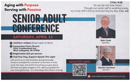 Senior Adult Conference will be held Saturday, April 11th, at Connection Point Church from 10:00am-4:00pm. Join us for an on-site luncheon during the break! Access is available for a donation at the door to help cover the meal, and 100% of anything you give above the food cost goes straight to STL. We’re so grateful for your extra generosity - it’s what keeps this mission moving!
